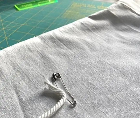 DIY Linen Bread Bag image for tutorial on how to make your own linen bread bag showing white linen cloth on green cutting mat with safety pin and white cording laying on top